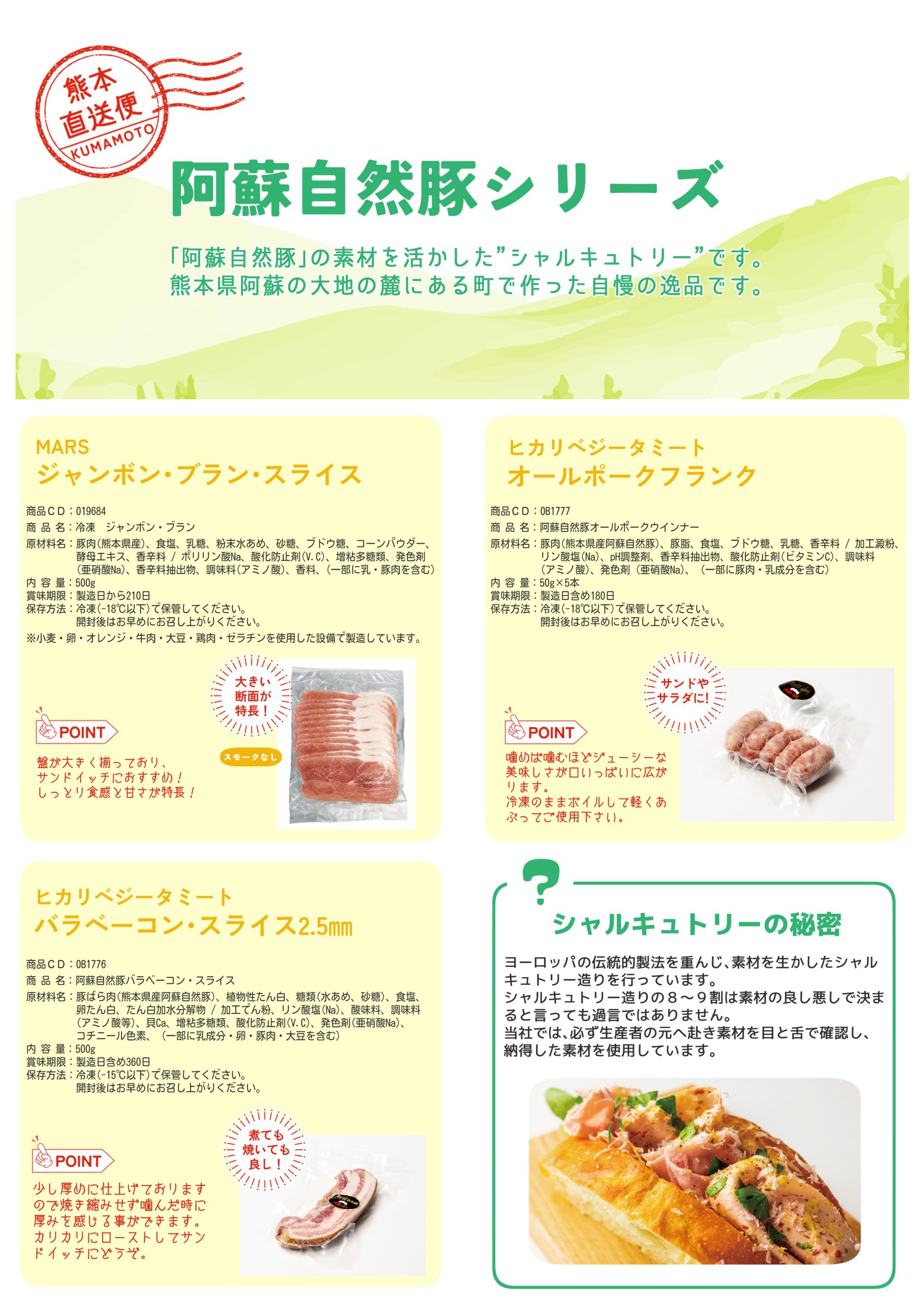 - 豚肉(熊本県産)、食塩、乳糖、粉末水あめ、砂糖、ブドウ糖、コーンパウダー、酵母エキス、香辛料 / ポリリン酸Na、酸化防止剤(V.C)、増粘多糖類、発色剤(亜硝酸Na)、香辛料抽出物、調味料(アミノ酸)、香料、(一部に乳・豚肉を含む)